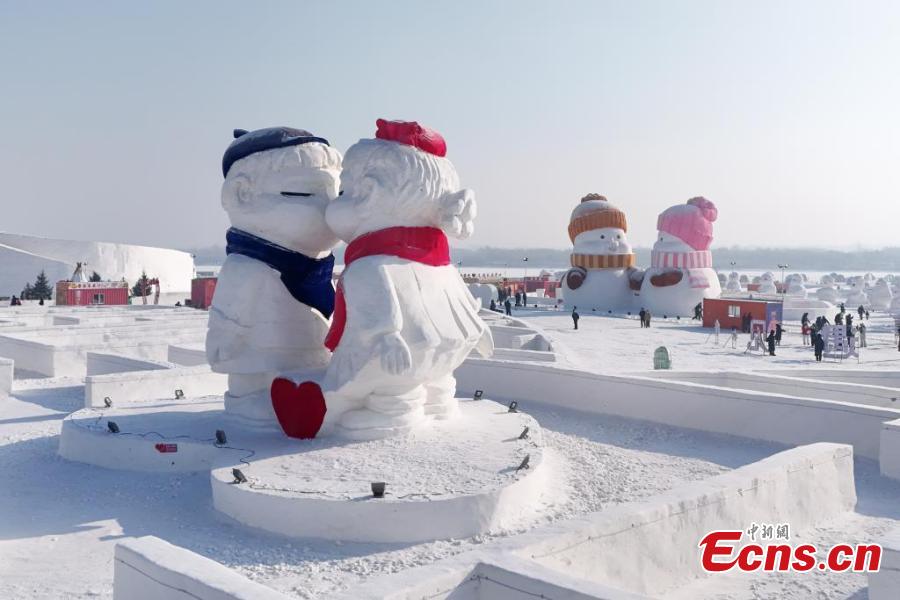 Visitors pose for photos with snowman sculptures in Harbin, northeast China's Heilongjiang Province, Jan. 2, 2025. (Photo: China News Service/Zhao Yuhang)