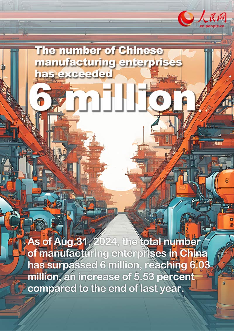 As of Aug.31, 2024, the total number of manufacturing enterprises in China has surpassed 6 million, reaching 6.03 million, an increase of 5.53 percent compared to the end of last year. This growth presents three positive trends: