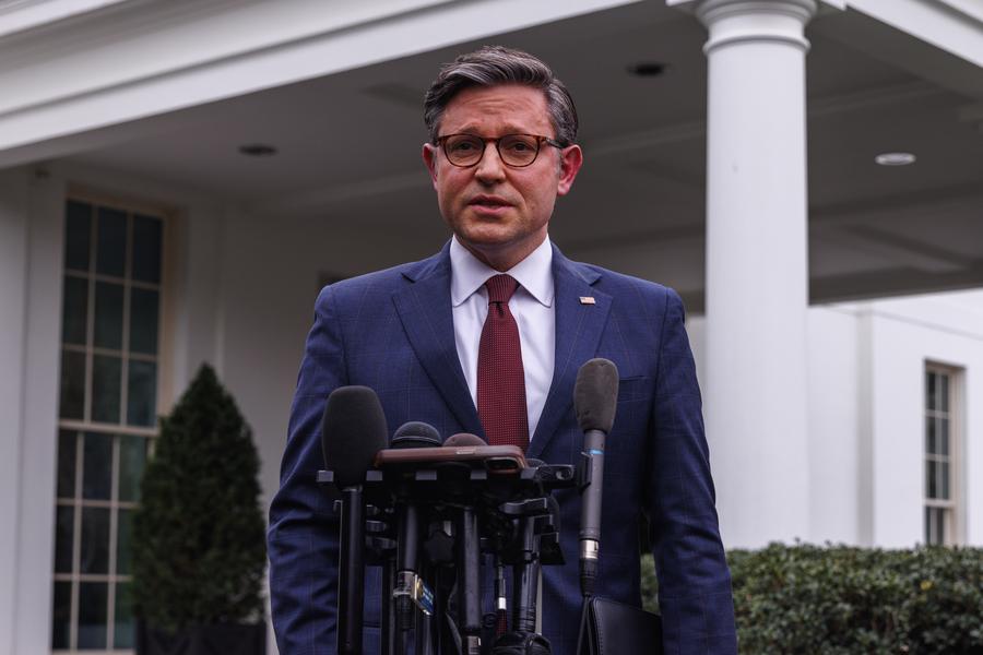U.S. House Speaker Mike Johnson speaks to the press outside the West Wing of the White House in Washington, D.C., the United States, Feb. 27, 2024. (Photo by Aaron Schwartz/Xinhua)
