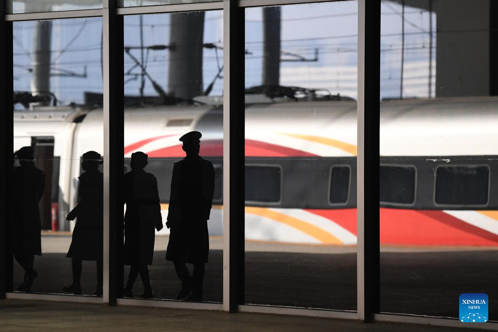 Train attendants of a high-speed train service from Xi'an to Hong Kong prepare to work at Xi'an North Railway Station in Xi'an, northwest China's Shaanxi Province, Jan. 5, 2025. A direct high-speed train route was launched on Sunday between Xi'an, the capital of northwest China's Shaanxi Province, and the Hong Kong Special Administrative Region. A single trip in either direction takes less than 11 hours. Along the direct route, there are stations in the provinces of Shaanxi, Henan, Hubei, Hunan and Guangdong. (Xinhua/Li Yibo)