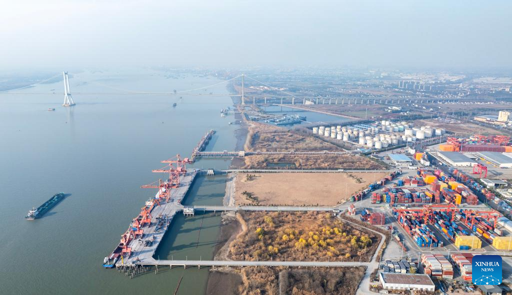 An aerial drone photo shows a view of Taizhou Port in east China's Jiangsu Province, Jan. 2, 2025. China's major ports are busy at the beginning of the new year. (Photo by Zhou Shegen/Xinhua)