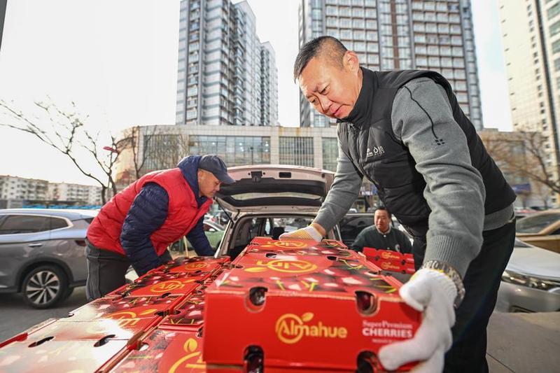 Staff members of a supermarket carry Chilean cherries in Xiqing district of Tianjin, North China, Dec 26, 2024. (Photo/Xinhua)