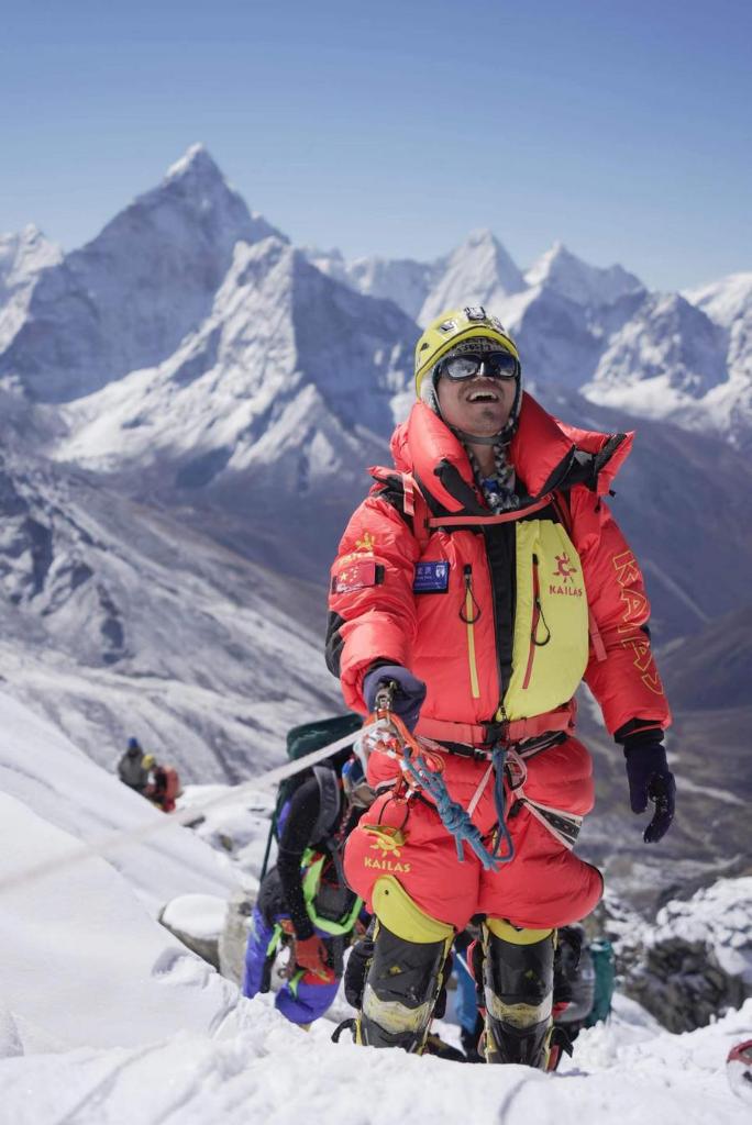 This file photo taken on April 18, 2021 shows Zhang Hong climbing Mt. Lobuche in Nepal. (Photo by Ding Liang/Xinhua)