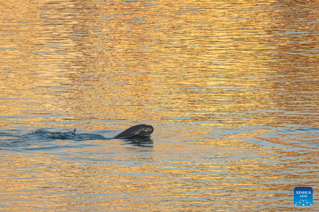 This photo taken on Jan. 5, 2025 shows a Yangtze finless porpoise swimming near the lower reaches of the Gezhouba Dam in Yichang City, central China's Hubei Province. The Yangtze finless porpoise is a national first-class protected wild animal and its population status serves as a "barometer" of the ecological environment of the Yangtze River. In recent years, the population of the species here has increased steadily as systematic ecological restoration efforts were implemented. (Xinhua/Xiao Yijiu)