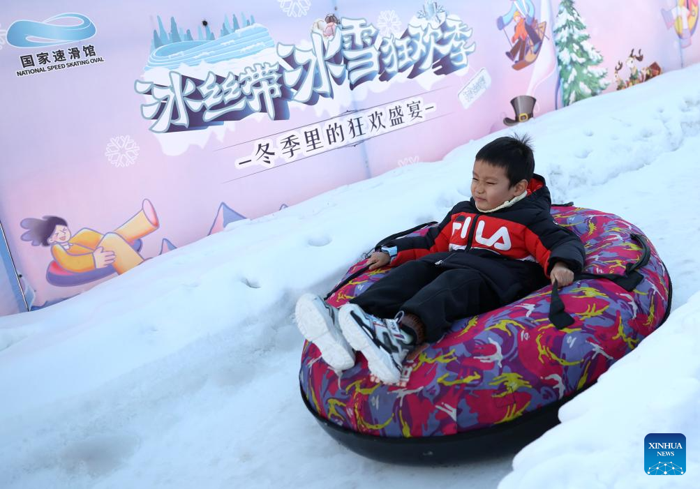 A boy has fun at the National Speed Skating Oval in Beijing, capital of China, Jan. 4, 2025. People flocked to the National Speed Skating Oval to have fun with ice and snow during the weekend. (Xinhua/Zhang Chenlin)