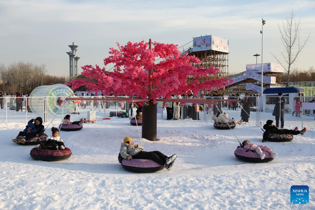 People enjoy themselves at the National Speed Skating Oval in Beijing, capital of China, Jan. 4, 2025. People flocked to the National Speed Skating Oval to have fun with ice and snow during the weekend. (Xinhua/Zhang Chenlin)