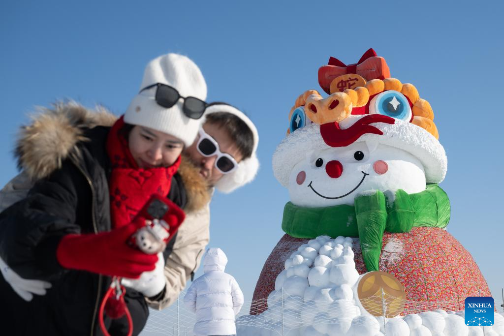 People pose for photos with a snowman at a farm of Beidahuang Group in Harbin, capital of northeast China's Heilongjiang Province, Jan. 4, 2025. Harbin, with many snow sculptures across the city, has emerged as one of China's top winter travel destinations, attracting tourists from around the globe. (Xinhua/Zhang Tao)