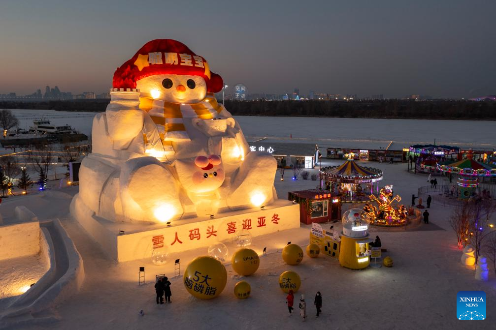 An aerial drone photo taken on Jan. 3, 2025 shows a giant snowman at a dock in Harbin, capital of northeast China's Heilongjiang Province. Harbin, with many snow sculptures across the city, has emerged as one of China's top winter travel destinations, attracting tourists from around the globe. (Xinhua/Xie Jianfei)