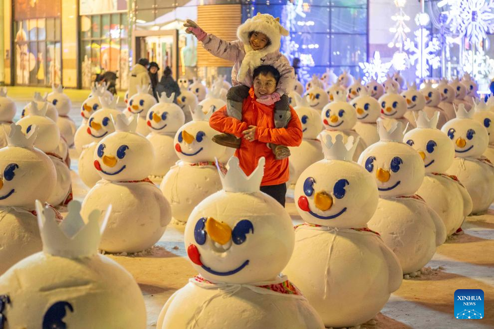 People have fun among snowmen in front of a shopping mall in Harbin, capital of northeast China's Heilongjiang Province, Jan. 3, 2025. Harbin, with many snow sculptures across the city, has emerged as one of China's top winter travel destinations, attracting tourists from around the globe. (Xinhua/Xie Jianfei)