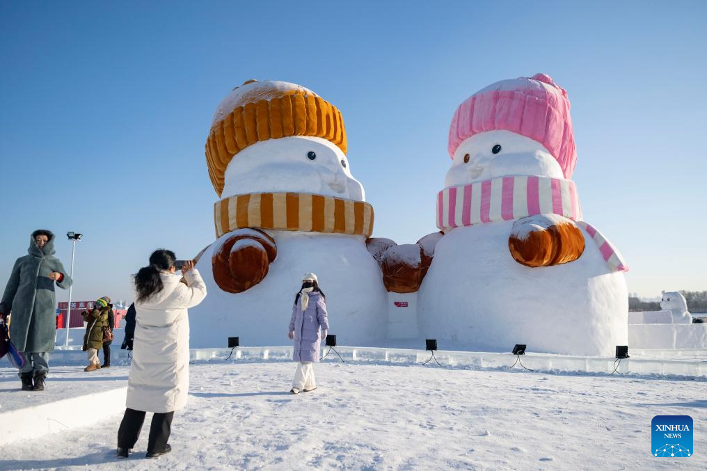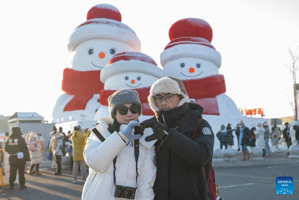 People pose for photos with snowmen "Dongdong" and "Beibei" in Harbin, capital of northeast China's Heilongjiang Province, Jan. 3, 2025. Harbin, with many snow sculptures across the city, has emerged as one of China's top winter travel destinations, attracting tourists from around the globe. (Xinhua/Xie Jianfei)