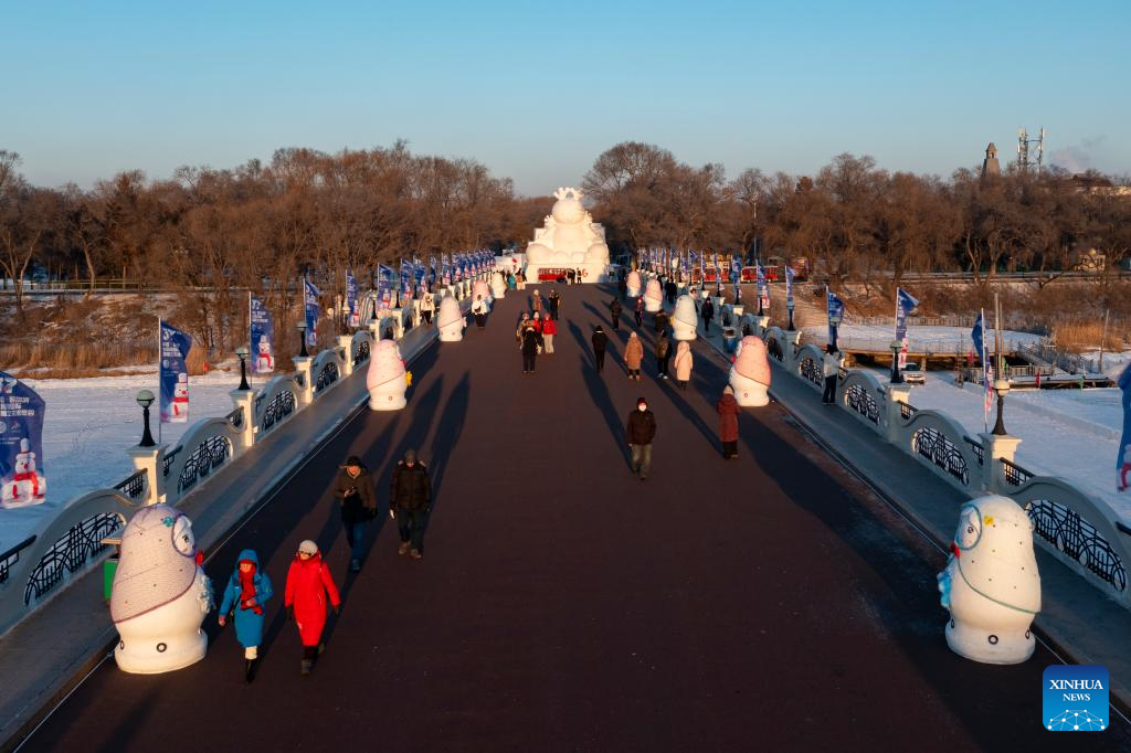 An aerial drone photo taken on Jan. 3, 2025 shows people walking past snowmen at the entrance of Sun Island International Snow Sculpture Expo in Harbin, capital of northeast China's Heilongjiang Province. Harbin, with many snow sculptures across the city, has emerged as one of China's top winter travel destinations, attracting tourists from around the globe. (Xinhua/Xie Jianfei)