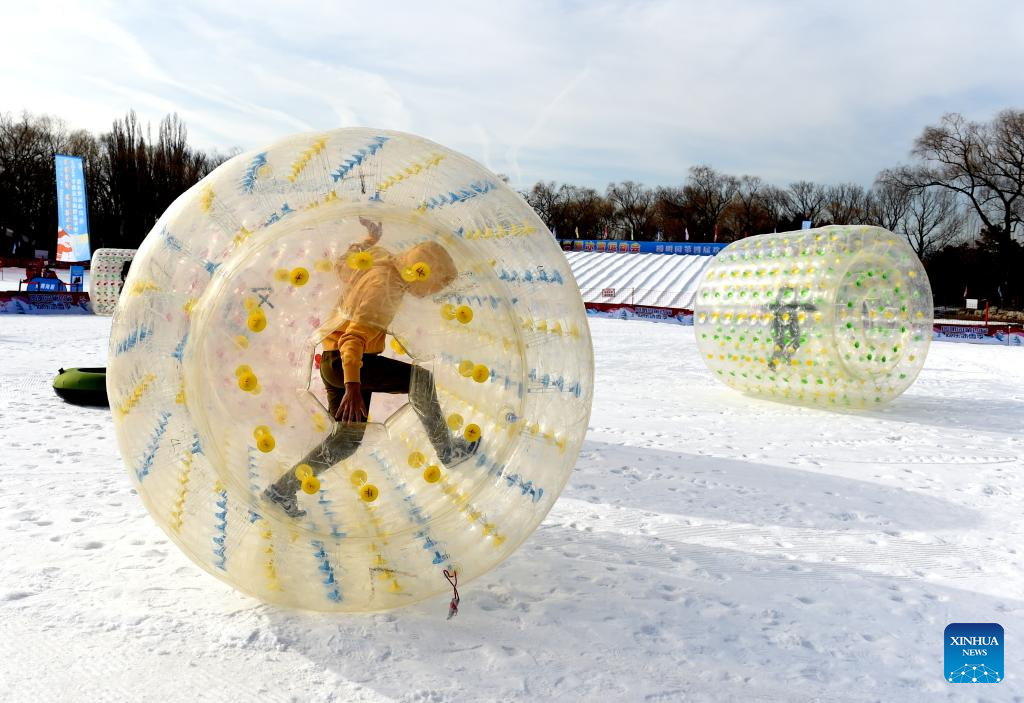Visitors have fun at Yuanmingyuan Park in Beijing, capital of China, Jan. 4, 2025. The ice and snow festival of Yuanmingyuan Park kicked off on Saturday. (Xinhua/Luo Xiaoguang)