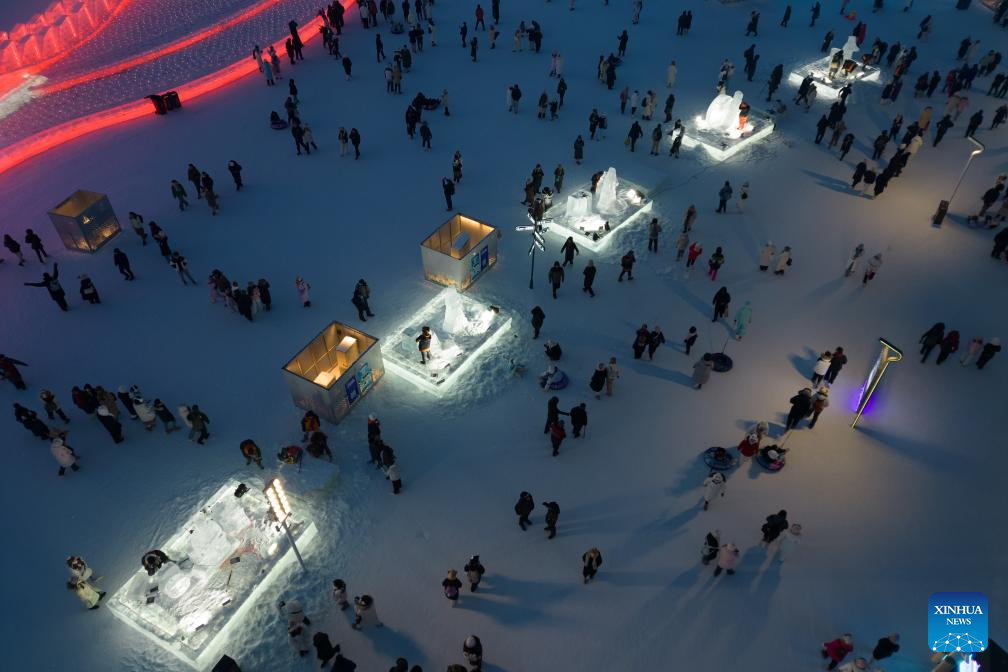 An aerial drone photo taken on Jan. 4, 2025 shows members of an ice sculpture team from the College of Art and Design of Daqing Normal University working on ice sculptures inspired by Terra-cotta Warriors at Harbin Ice-Snow World in Harbin, northeast China's Heilongjiang Province. A group of five ice "Terra-cotta Warriors" in different postures will soon make their debut at the Harbin Ice-Snow World. (Xinhua/Zhang Tao)