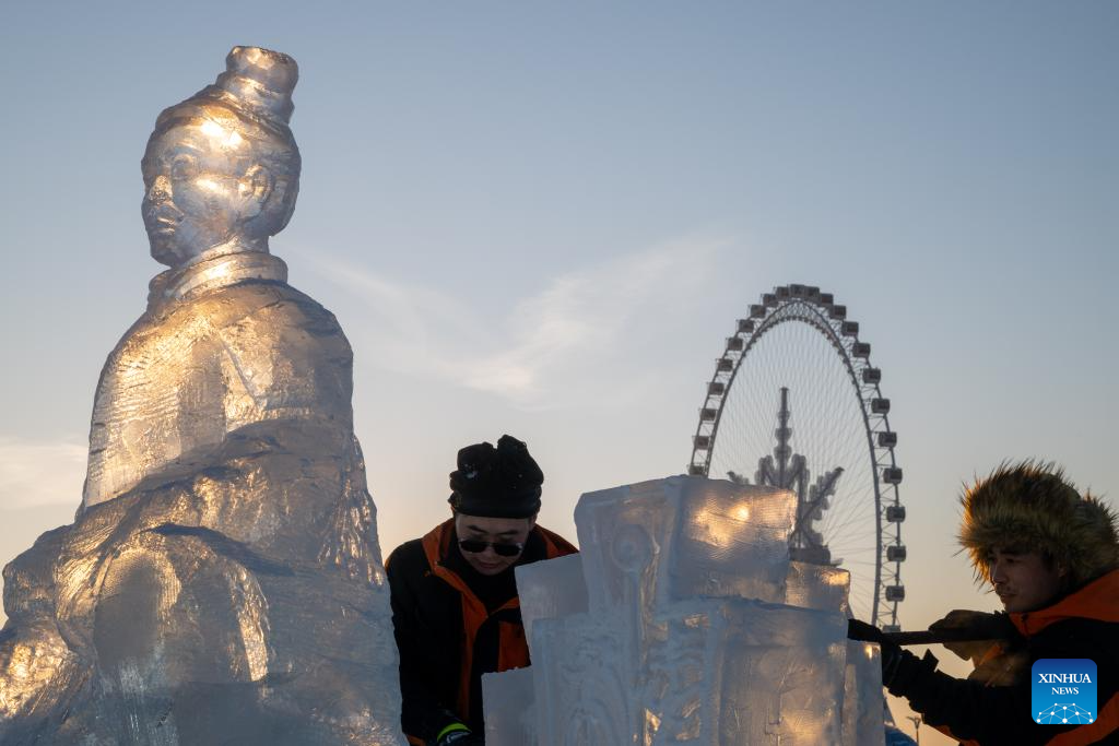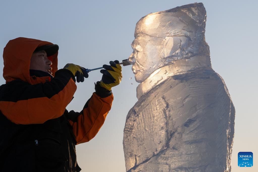 A member of an ice sculpture team from the College of Art and Design of Daqing Normal University works on an ice sculpture inspired by Terra-cotta Warriors at Harbin Ice-Snow World in Harbin, northeast China's Heilongjiang Province, Jan. 4, 2025. A group of five ice "Terra-cotta Warriors" in different postures will soon make their debut at the Harbin Ice-Snow World. (Xinhua/Zhang Tao)