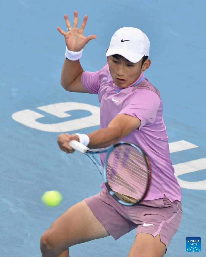 Shang Juncheng hits a return during the semifinal between Shang Juncheng of China and Nishikori Kei of Japan at the ATP250 Hong Kong Tennis Open in Hong Kong, south China, Jan. 4, 2025. (Photo by Lo Ping Fai/Xinhua)