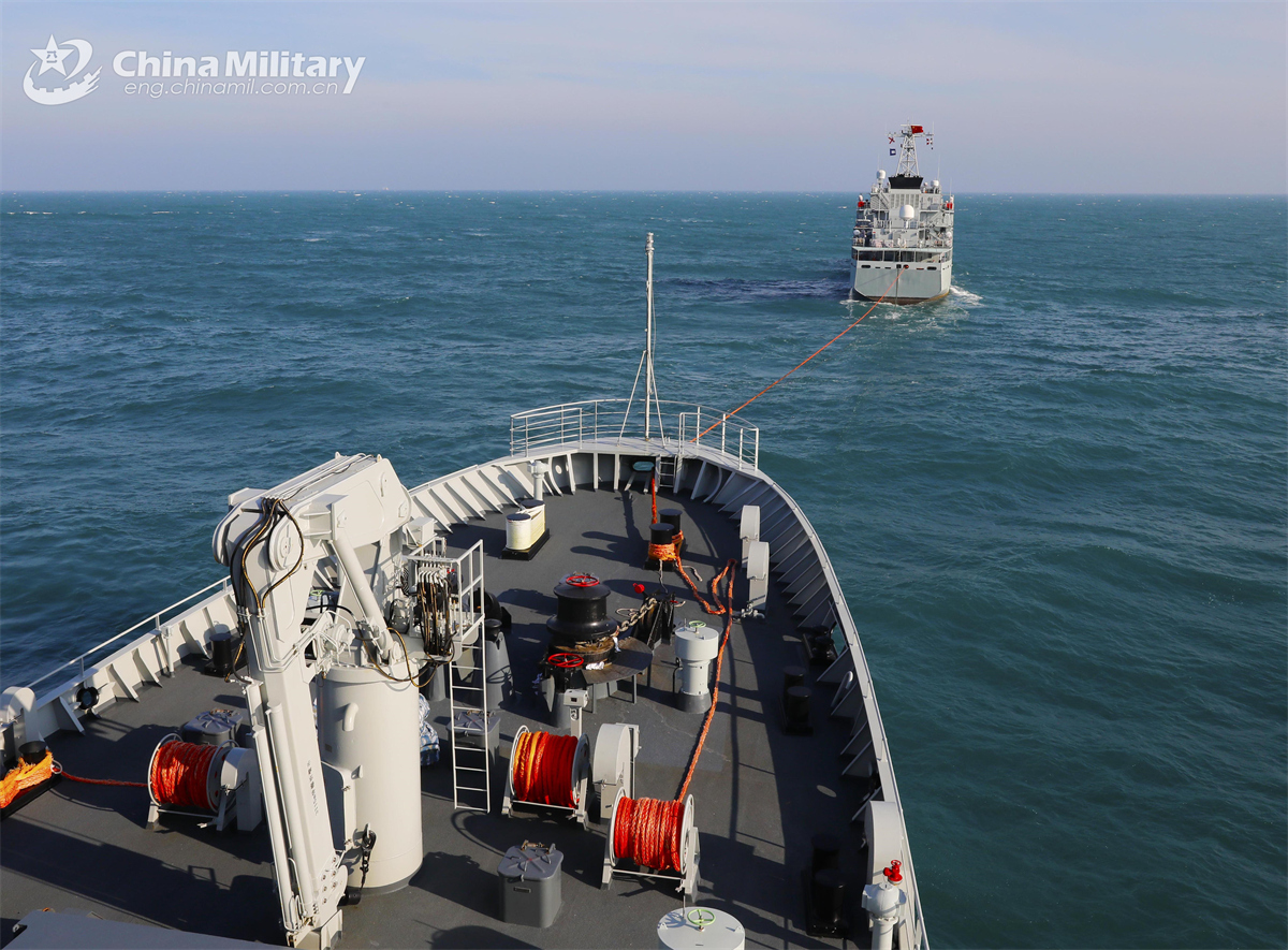 NANSHUI 978 tanker attached to a naval service ship group of the Chinese PLA Southern Theater Command conducts astern replenishment-at-sea to NANYUN 830 troop carrier during a replenishment-at-sea training exercise on December 10, 2024. (eng.chinamil.com.cn/Photo by Wu Huanqing)
