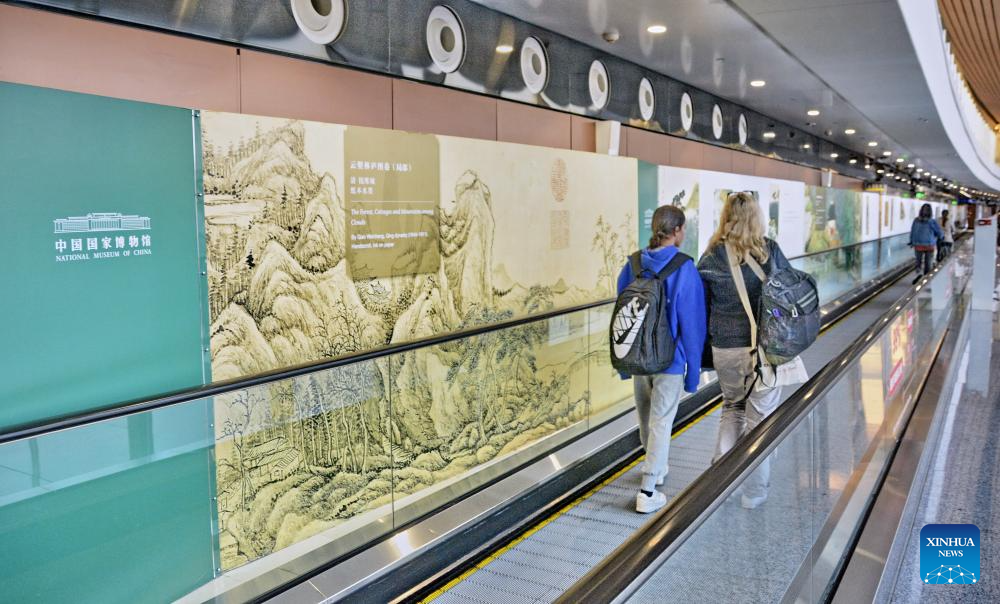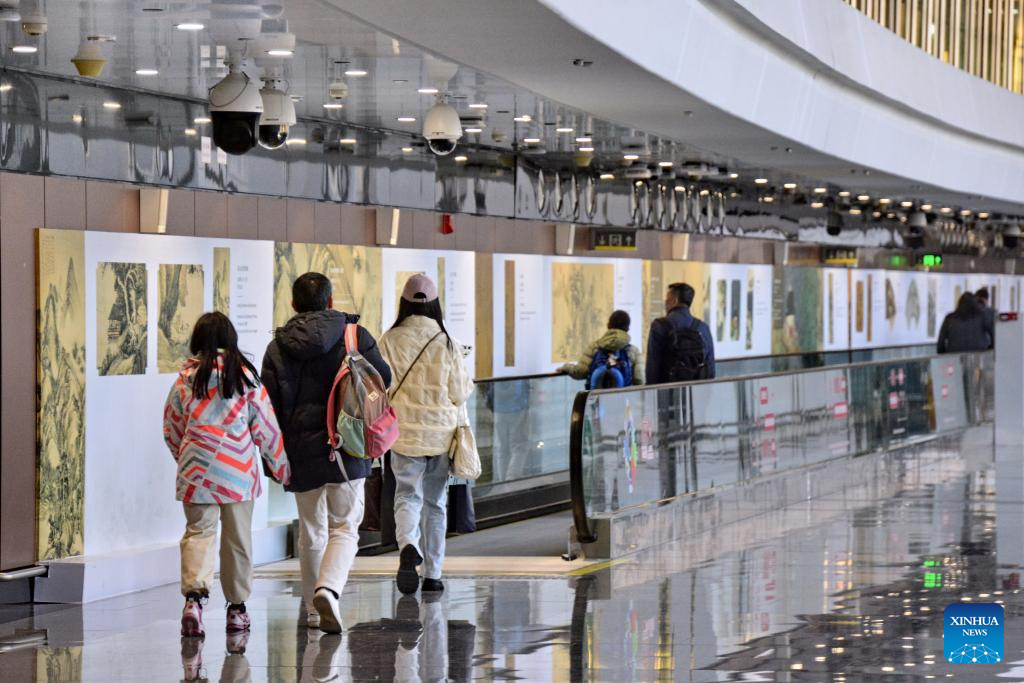 Passengers pass through an "art corridor" at the Beijing Daxing International Airport, in Beijing, capital of China, Jan. 4, 2025. (Xinhua/Li Xin)