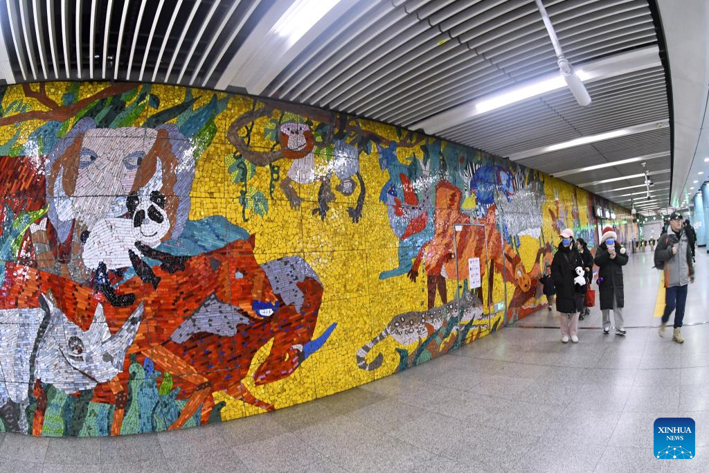 This photo taken on Jan. 1, 2025 shows a ceramic tile artwork at Beijing Zoo Station on Beijing Subway Line 4 in Beijing, capital of China. (Xinhua/Li Xin)