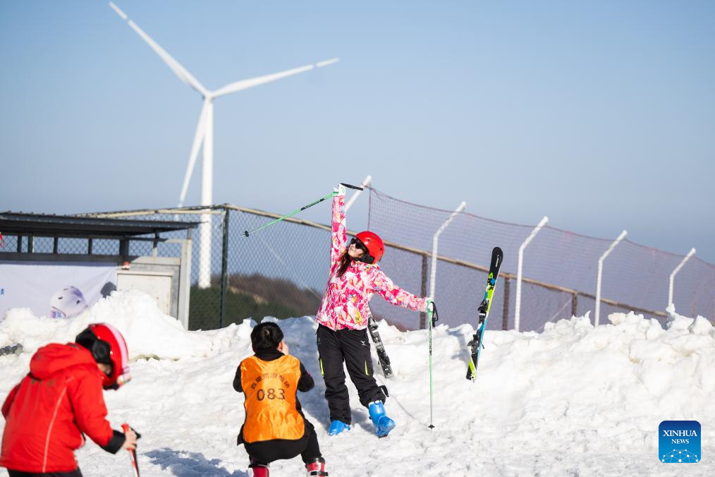 Tourists take photos at Bailihuang Ski Resort in Yichang City, central China's Hubei Province, Jan. 5, 2025. In recent years, Yichang has explored its ice and snow tourism resources, attracting numerous tourists. (Xinhua/Xiao Yijiu)