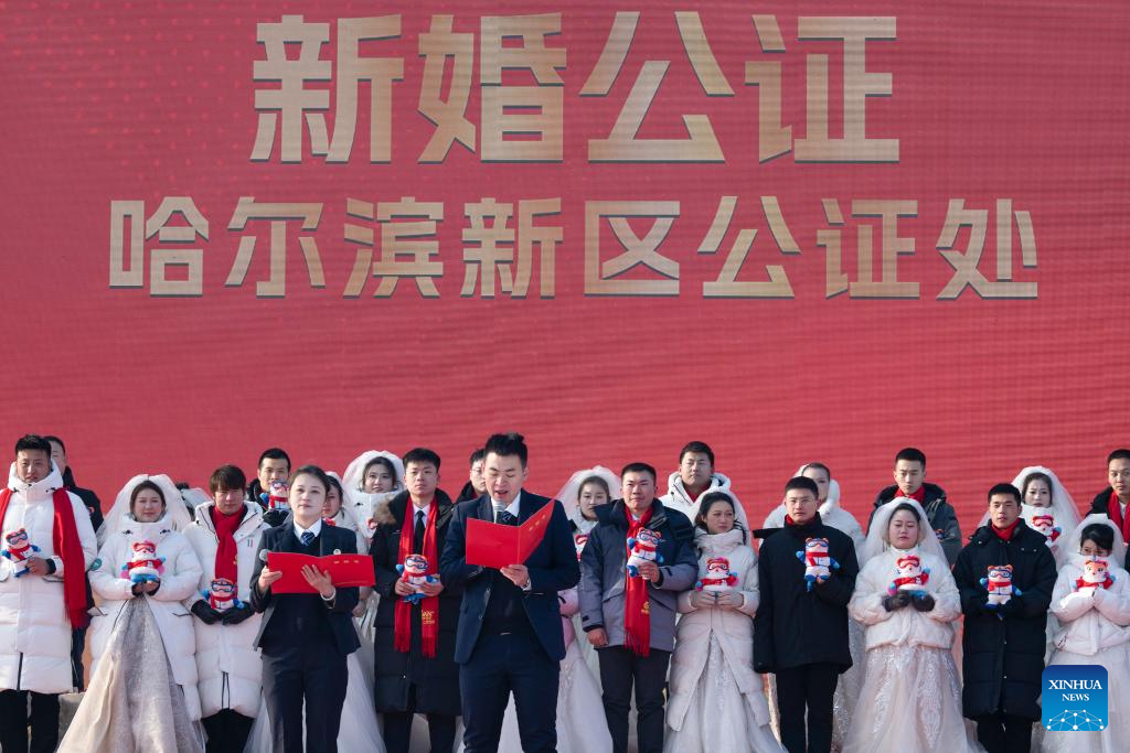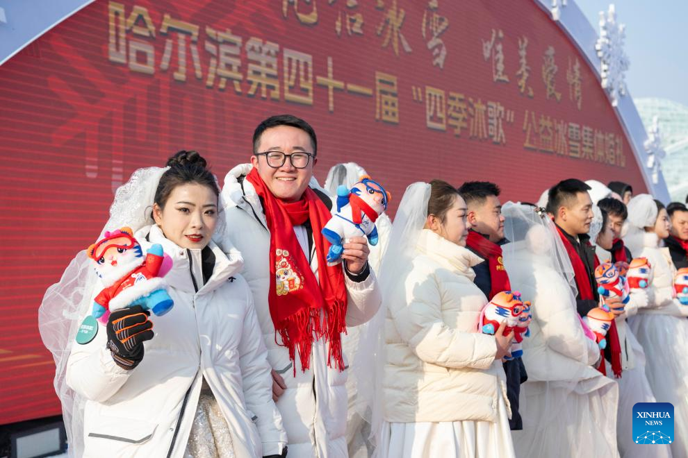 Loving couples take part in a group wedding at the Harbin Ice-Snow World in Harbin, northeast China's Heilongjiang Province, Jan. 6, 2025. A free group wedding which is part of the Harbin International Ice and Snow Festival was held at the Harbin Ice-Snow World on Monday. The winter-themed event was participated by 43 couples from 17 provinces, municipalities or regions in China. (Xinhua/Zhang Tao)