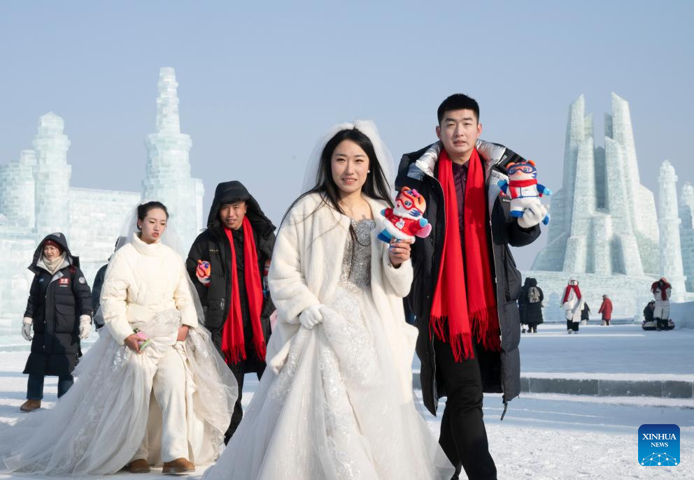Loving couples participating in a group wedding have fun at the Harbin Ice-Snow World in Harbin, northeast China's Heilongjiang Province, Jan. 6, 2025. A free group wedding which is part of the Harbin International Ice and Snow Festival was held at the Harbin Ice-Snow World on Monday. The winter-themed event was participated by 43 couples from 17 provinces, municipalities or regions in China. (Xinhua/Zhang Tao)