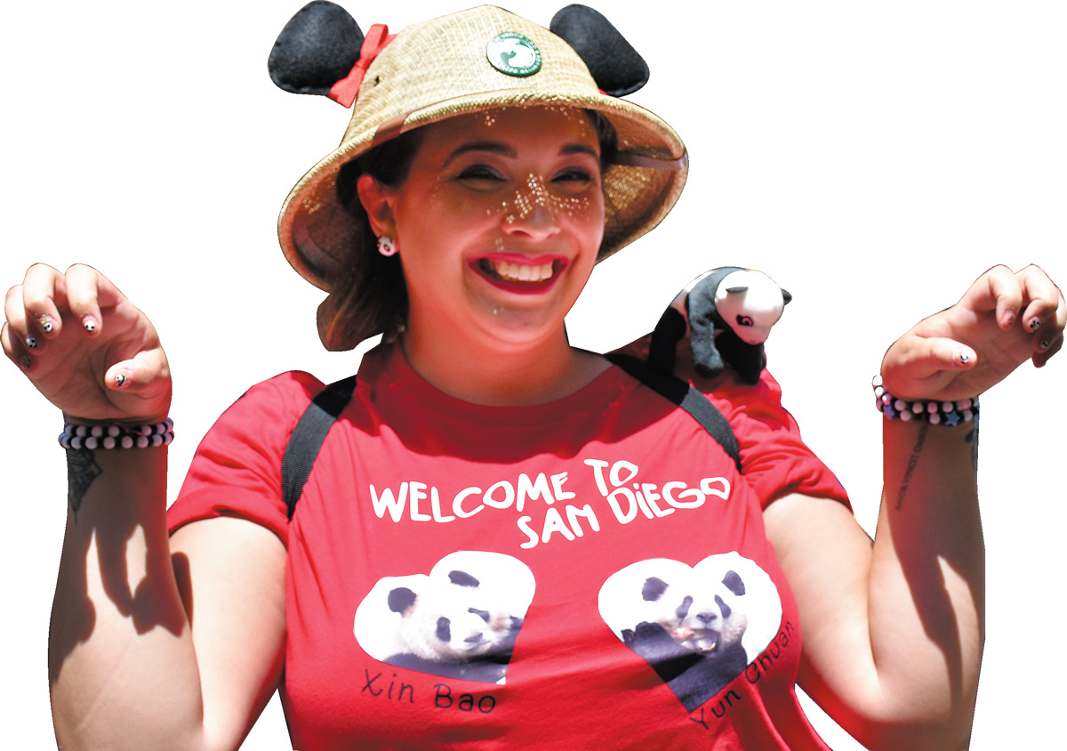 A tourist wears her self-made T-shirt with patterns of the panda pair at the San Diego Zoo on Aug 8. (Zeng Hui/Xinhua)