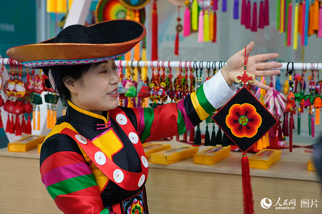 A staff member proudly introduces embroidery products handcrafted using the techniques of Panxiu, a type of embroidery popular among people of the Tu ethnic group, at a Panxiu industrial base in Huzhu Tu Autonomous County, northwest China's Qinghai Province, Sept. 13, 2024. (People's Daily Online/Yang Qihong)