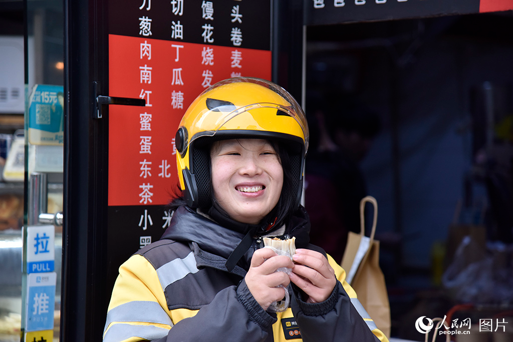 A food delivery rider named Huang Mengdan enjoys a steaming Shao Mai, a kind of traditional Chinese steamed dumplings, following her work of the morning peak hours in east China's Shanghai, Dec. 25, 2024. (People's Daily Online/Gong Sha)
