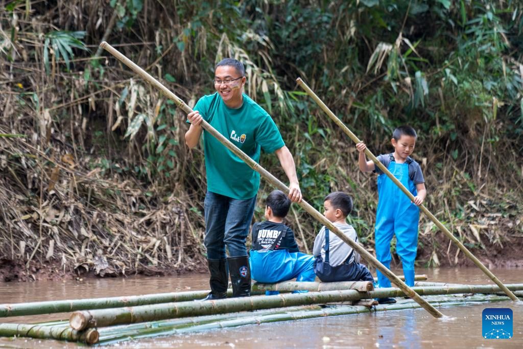 Tourists paddle a bamboo raft at Jinuoshan Town, Jinghong City of Xishuangbanna Dai Autonomous Prefecture, southwest China's Yunnan Province, Jan. 5, 2025. Jinuo ethnic group is one of the ethnic minorities in China, with the majority residing in Jinghong City. In recent years, local authorities have made efforts to develop tourism by taking advantage of the rainforest resources and ethnic cultures, effectively increasing the income of local residents. (Xinhua/Peng Yikai)