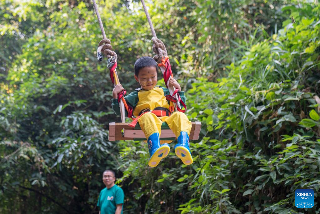 A child enjoys swing in Jinuoshan Town in Jinghong City of Xishuangbanna Dai Autonomous Prefecture, southwest China's Yunnan Province, Jan. 5, 2025. Jinuo ethnic group is one of the ethnic minorities in China, with the majority residing in Jinghong City. In recent years, local authorities have made efforts to develop tourism by taking advantage of the rainforest resources and ethnic cultures, effectively increasing the income of local residents. (Xinhua/Peng Yikai)
