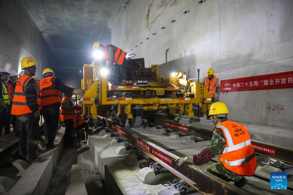 Constructors work at Dayuan Station of the Guangfo (Guangzhou-Foshan) east ring intercity railway in Guangzhou, south China's Guangdong Province, Jan. 6, 2025. The track laying work of the Guangfo east ring intercity railway was completed on Monday. The project is a section of Guangzhou-Foshan circular intercity railway and also an important part of the intercity railway network of the Guangdong-Hong Kong-Macao Greater Bay Area. (Xinhua/Liu Dawei)
