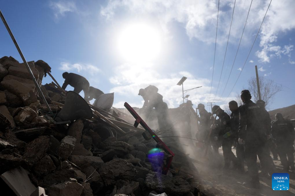 Rescuers work at a village in Changsuo Township of Dingri County in Xigaze, southwest China's Xizang Autonomous Region, Jan. 7, 2025. A total of 126 people have been confirmed dead and 188 others injured as of 7 p.m. Tuesday, after a 6.8-magnitude earthquake jolted Dingri County on Tuesday morning. (Xinhua/Jigme Dorje)