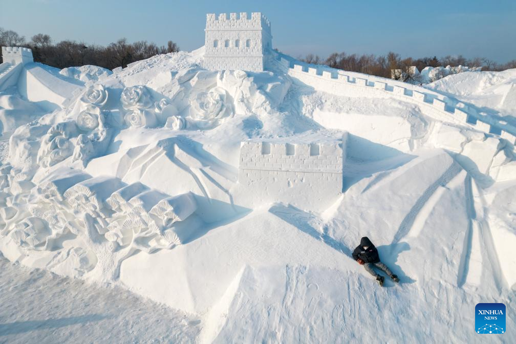 An aerial drone photo taken on Jan. 6, 2025 shows a tourist having fun at the Harbin Ice-Snow World in Harbin, northeast China's Heilongjiang Province. Harbin, with its rich ice and snow resources and a diverse array of winter activities, has emerged as one of China's top winter travel destinations. (Xinhua/Zhang Tao)