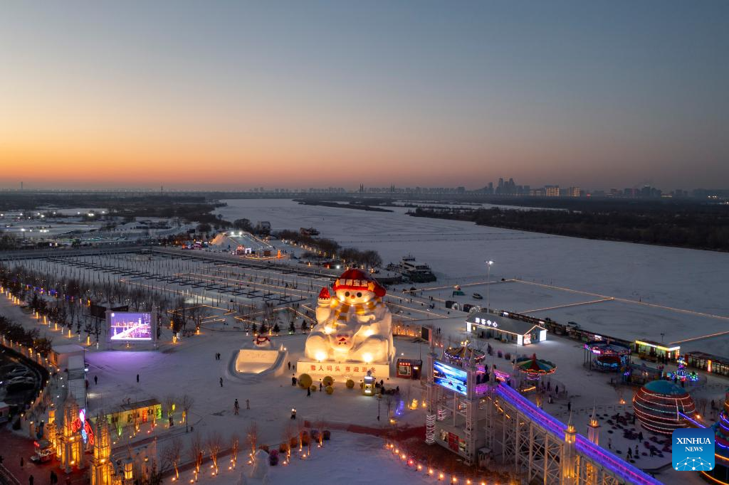 An aerial drone photo taken on Jan. 3, 2025 shows people having fun around a giant snowman at a dock in Harbin, capital of northeast China's Heilongjiang Province. Harbin, with its rich ice and snow resources and a diverse array of winter activities, has emerged as one of China's top winter travel destinations. (Xinhua/Xie Jianfei)