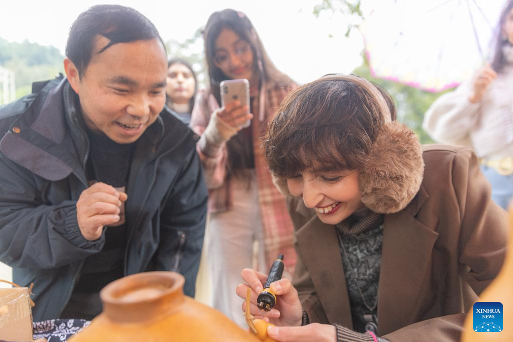 An international student tries gourd carving in Pianyan ancient town, Beibei District, southwest China's Chongqing Municipality, Jan. 7, 2025. A group of international students attended a cultural event here on Tuesday to experience traditional Chinese culture. (Xinhua/Huang Wei)