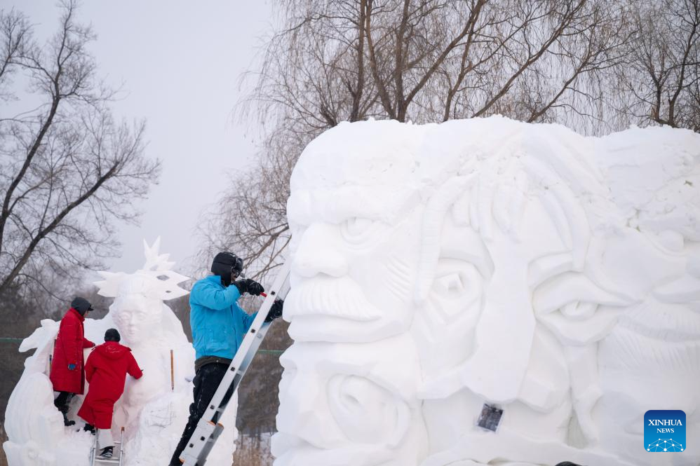 Contestants work on snow sculptures at the Sun Island International Snow Sculpture Art Expo park in Harbin, northeast China's Heilongjiang Province, Jan. 7, 2025. The 27th Harbin international snow sculpture competition, attracting snow sculptors of more than 20 teams from 10 countries, entered its second competition day on Tuesday. Beautiful snow sculpture works have already taken shape after meticulous carving by snow sculpture artists. (Xinhua/Zhang Tao)
