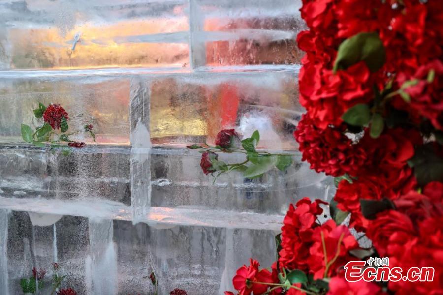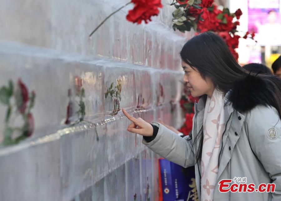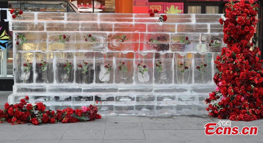 Bunches of red roses frozen in ice bricks attract many visitors to Shenyang, northeast China's Liaoning Province, Jan. 7, 2025. (China News Service/Yu Haiyang)