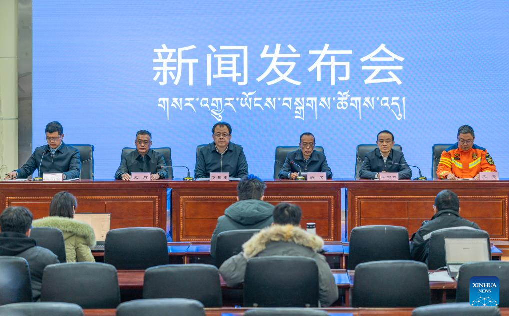 The second press conference is held by the city of Xigaze on the disaster relief work after a 6.8-magnitude earthquake jolted Dingri County in the city of Xigaze, southwest China's Xizang Autonomous Region, Jan. 8, 2025. (Xinhua/Tenzin Nyida)