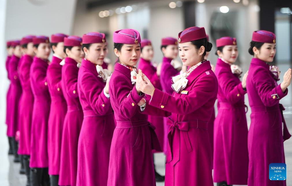 High-speed railway crew members take part in an etiquette training in Chongqing, southwest China, Jan. 8, 2025. The Chongqing branch of China Railway Chengdu Bureau Group Co., Ltd. organized training programs for high-speed railway crew members to improve service quality and prepare for the upcoming Spring Festival travel rush. (Xinhua/Wang Quanchao)