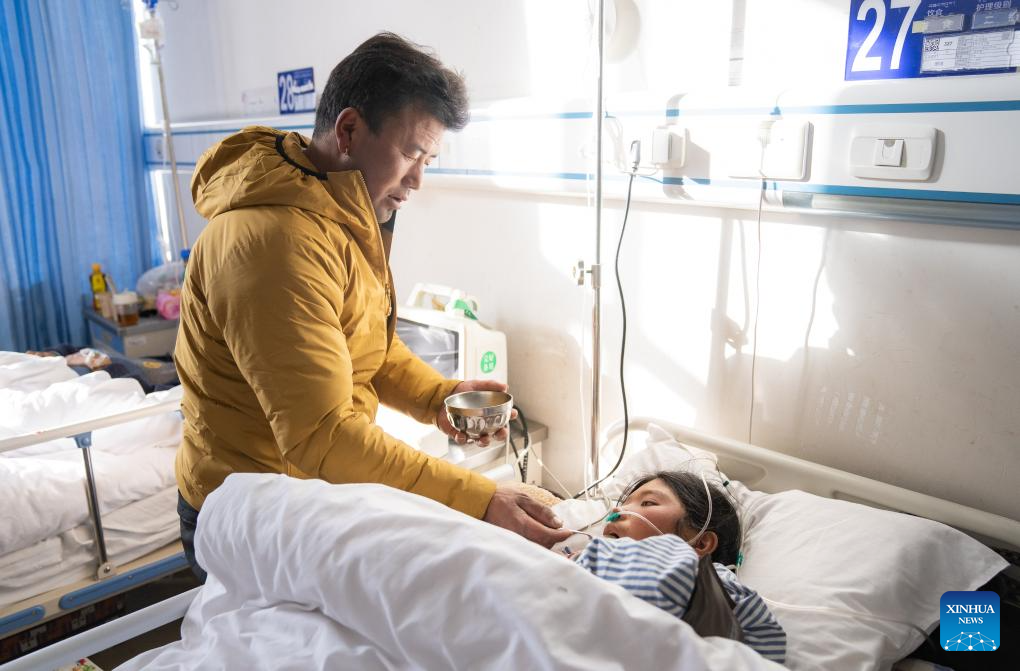 The mother of the first after-quake newborn take food with the help of a family member at the Xigaze People's Hospital in Xigaze City, southwest China's Xizang Autonomous Region, Jan. 9, 2025. The baby was given birth to on Thursday by a woman transferred from the earthquake's epicenter in Dingri County.