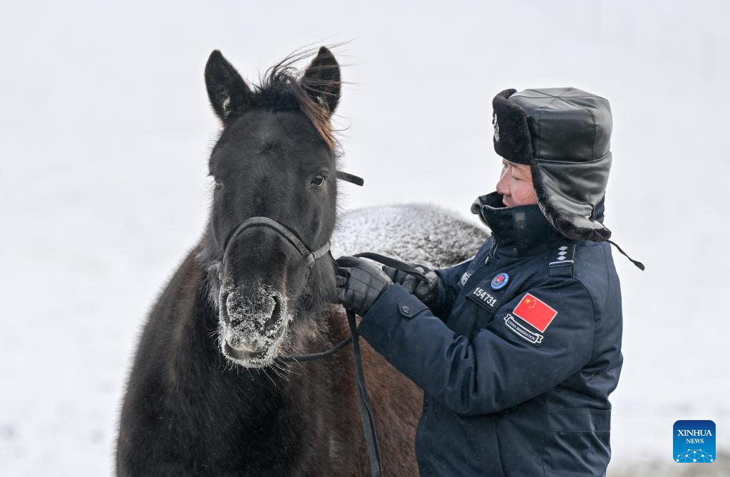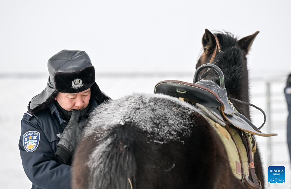 A policeman puts a saddle on a horse before patrolling in Xilin Gol League, north China's Inner Mongolia Autonomous Region, Dec. 27, 2024. (Xinhua/Lian Zhen)