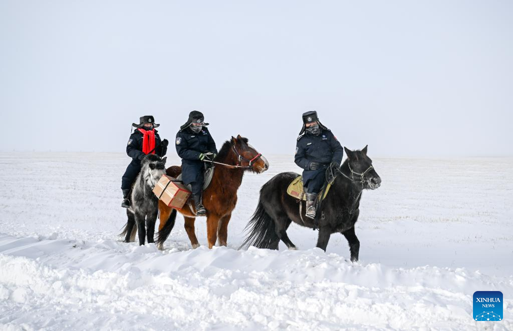 Mounted police deliver parcels to herdsmen in Xilin Gol League, north China's Inner Mongolia Autonomous Region, Dec. 27, 2024. (Xinhua/Lian Zhen)