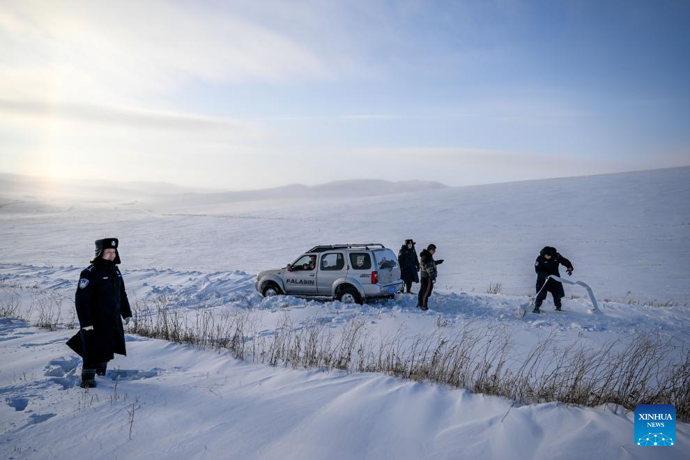 Police tie a tow rope to a snowbound vehicle in Xilin Gol League, north China's Inner Mongolia Autonomous Region, Dec. 27, 2024. (Xinhua/Lian Zhen)