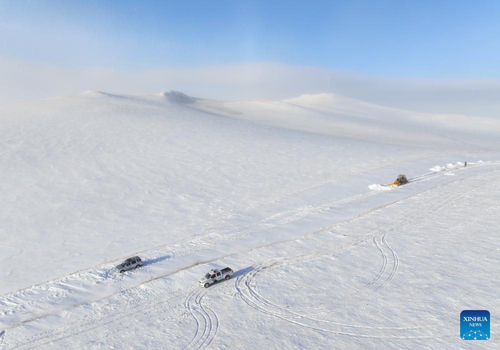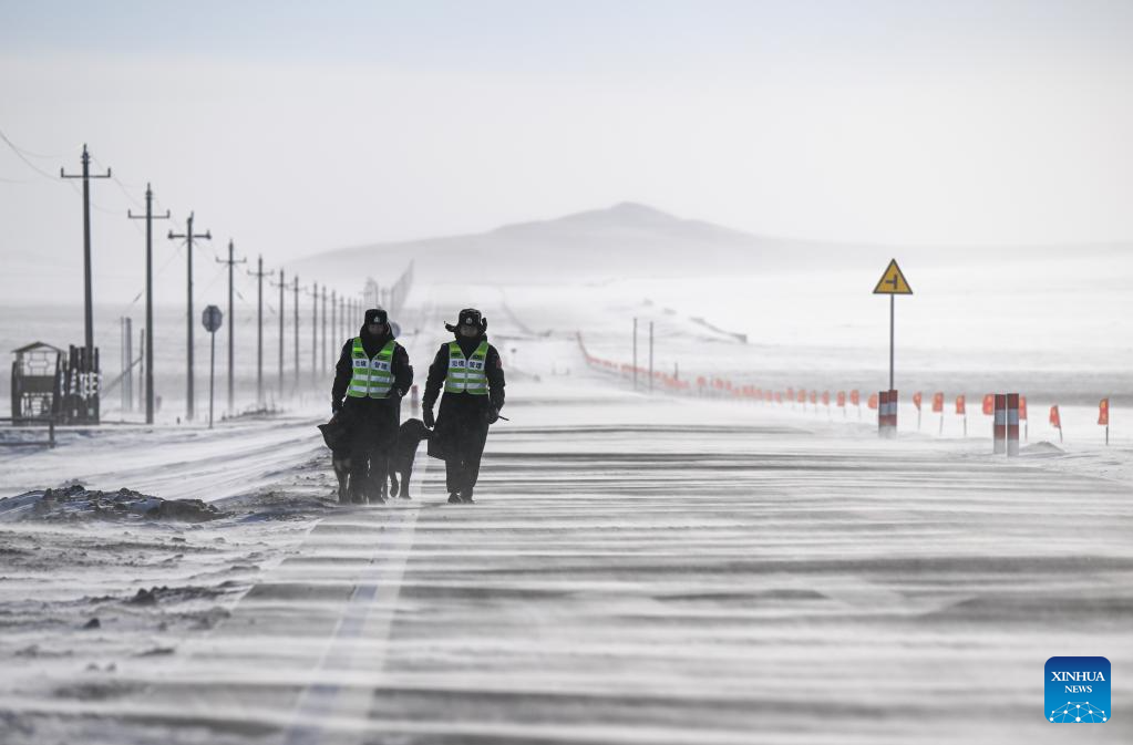 Policemen walk to a checkpoint in Xilin Gol League, north China's Inner Mongolia Autonomous Region, Jan. 8, 2025. (Xinhua/Lian Zhen)