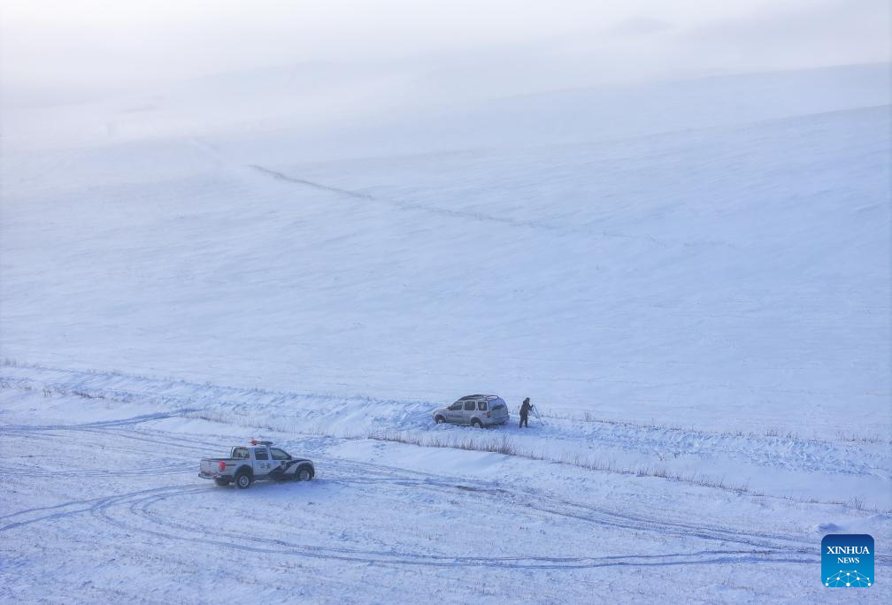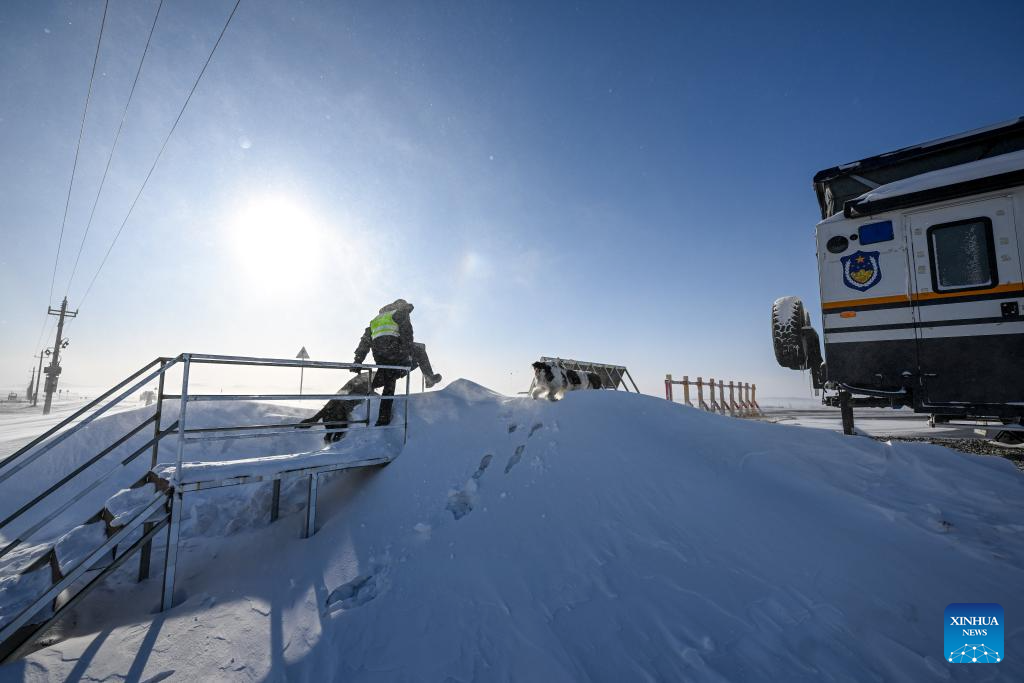 A policeman arrives at a checkpoint in Xilin Gol League, north China's Inner Mongolia Autonomous Region, Jan. 8, 2025. (Xinhua/Lian Zhen)
