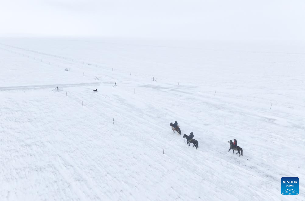 An aerial drone photo shows mounted police patrolling in Xilin Gol League, north China's Inner Mongolia Autonomous Region, Dec. 27, 2024. (Xinhua/Lian Zhen)