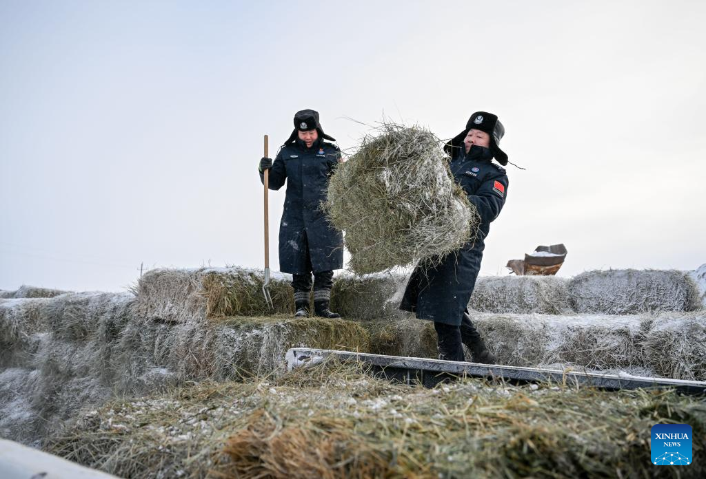 Policemen prepare to feed horses forage grass in Xilin Gol League, north China's Inner Mongolia Autonomous Region, Dec. 27, 2024. (Xinhua/Lian Zhen)