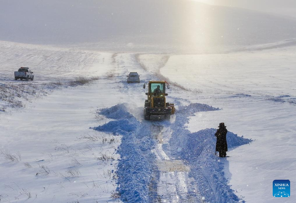 An aerial drone photo shows police directing a front loader to clear roads for snowbound travelers in Xilin Gol League, north China's Inner Mongolia Autonomous Region, Dec. 27, 2024. (Xinhua/Lian Zhen)