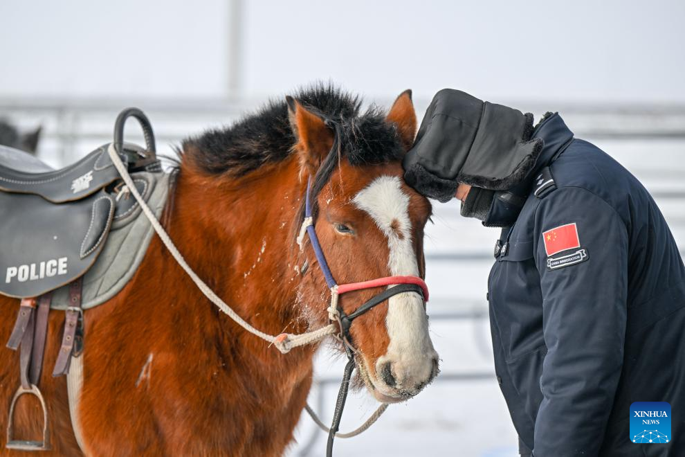 A policeman leans his head on the head of a horse before patrolling in Xilin Gol League, north China's Inner Mongolia Autonomous Region, Dec. 27, 2024. (Xinhua/Lian Zhen)