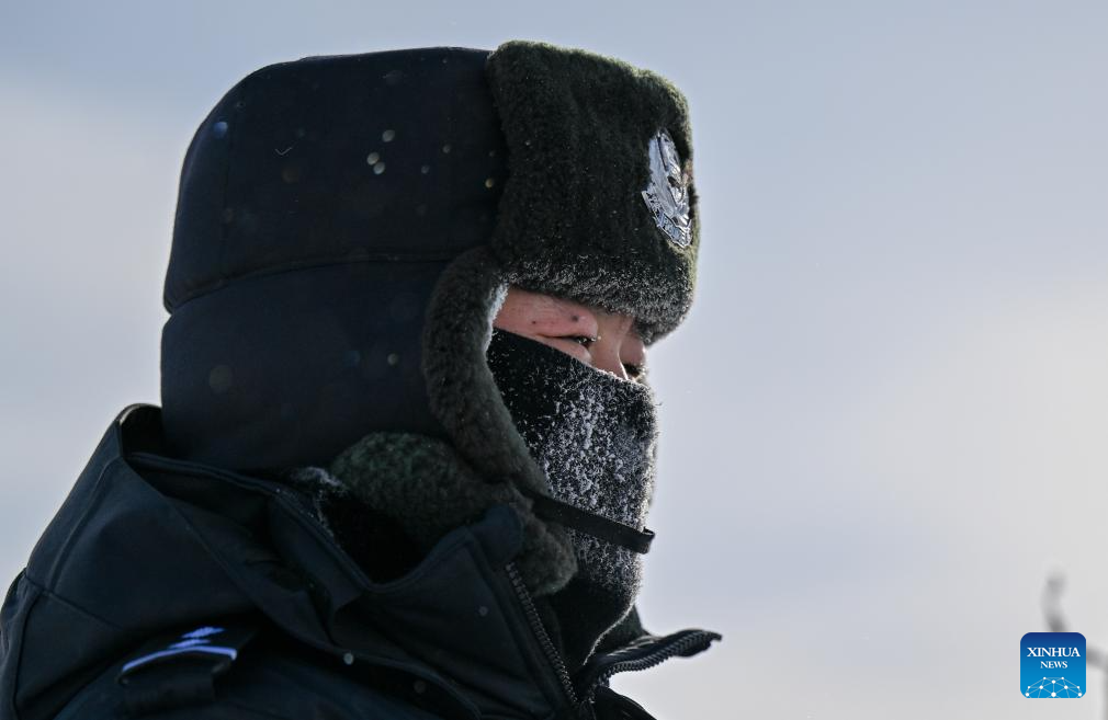 A policeman is pictured with his face mask covered with frost in Xilin Gol League, north China's Inner Mongolia Autonomous Region, Jan. 8, 2025. (Xinhua/Lian Zhen)